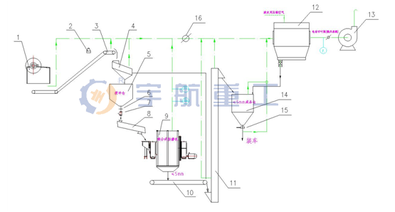 氧化鋁結殼塊通過(guò)顎式破碎機進(jìn)行初級破碎,破碎后<120mm物料通過(guò)大傾角皮帶機進(jìn)入單層振動(dòng)篩(單層振動(dòng)篩根據產(chǎn)能選用,可不用)進(jìn)行篩分,篩下物經(jīng)溜管通過(guò)斗提機后直接進(jìn)入成品,篩上物進(jìn)入緩沖倉后經(jīng)振動(dòng)給料機進(jìn)入篩分式粉磨機內進(jìn)行研磨粉碎,滿(mǎn)足要求的成品物料從磨機內排出,經(jīng)平皮帶機和斗提機輸送至成品倉。