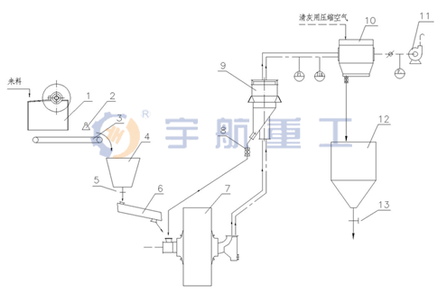 1.顎破 2.除鐵器 3.分級機 4.緩沖倉 5.棒調閥 6.振動(dòng)給料機 7.粉磨機 8.卸料閥 10.袋式收塵器 11.風(fēng)機 12. 成品倉 13.插板閥 14.其它輔助設備