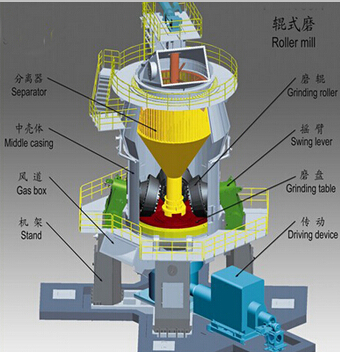 物料通過(guò)下料管落到磨盤(pán)中央,恒速旋轉著(zhù)的磨盤(pán)借助于離心力的作用將原料向外均勻分散、鋪平,使其形成一定厚度的料床,物料同時(shí)受到磨盤(pán)上多個(gè)磨輥的碾壓,并被粉碎。在離心力的連續驅使下物料不斷向磨盤(pán)外緣運動(dòng),當離開(kāi)磨盤(pán)的物料遇到通過(guò)風(fēng)環(huán)進(jìn)入磨內的熱氣體并隨之上升,經(jīng)磨機中部殼體進(jìn)入到分離器中,在此過(guò)程中物料與熱氣體進(jìn)行了充分的熱交換,水分迅速被蒸發(fā)。選粉機控制著(zhù)輥磨出口的成品粒度,大于規定尺寸的顆粒被分離,并落回到磨盤(pán),滿(mǎn)足細度要求的物料通過(guò)選粉機進(jìn)入收塵器,收集后的成品送入成品倉。