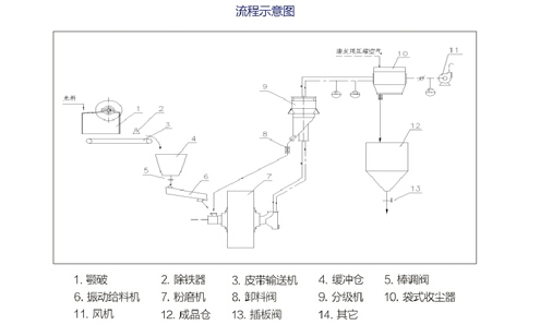 主要設備:顎式破碎機、粉磨機、斗式提升機、圓筒篩、袋式收塵器、風(fēng)機