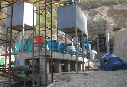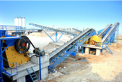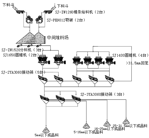 大塊石料經(jīng)料倉由振動(dòng)給料機均勻地送進(jìn)顎式破碎機進(jìn)行粗碎,粗碎后的石料由膠帶輸送機送到反擊式破碎機進(jìn)行進(jìn)一步破碎;細碎后的石料由膠帶輸送機送進(jìn)振動(dòng)篩進(jìn)行篩分,篩分出幾種不同規格的石子,滿(mǎn)足粒度要求的石子由成品膠帶輸送機送往成品料堆;不滿(mǎn)足粒度要求的石子由膠帶輸送機返料送到反擊式破碎機進(jìn)行再次破碎,形成閉路多次循環(huán)。