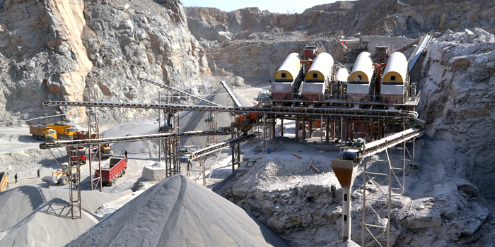大塊石料經(jīng)料倉由振動(dòng)給料機均勻地送進(jìn)顎式破碎機進(jìn)行粗碎,粗碎后的石料由膠帶輸送機送到反擊式破碎機進(jìn)行進(jìn)一步破碎;細碎后的石料由膠帶輸送機送進(jìn)振動(dòng)篩進(jìn)行篩分,篩分出幾種不同規格的石子,滿(mǎn)足粒度要求的石子由成品膠帶輸送機送往成品料堆;不滿(mǎn)足粒度要求的石子由膠帶輸送機返料送到反擊式破碎機進(jìn)行再次破碎,形成閉路多次循環(huán)。