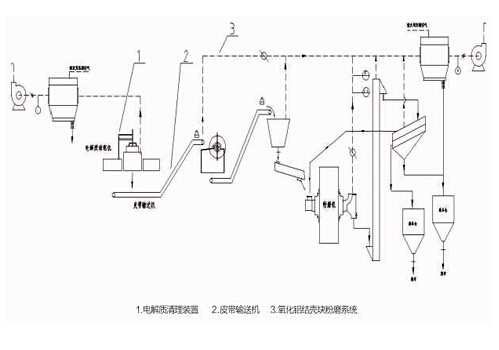主要設備:電解質(zhì)清理裝置、皮帶輸送機、氧化鋁結殼塊粉磨系統